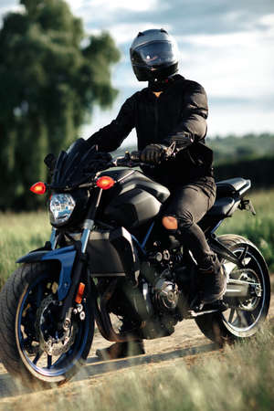 Photo of biker sitting on motorcycle in sunset on the country road.