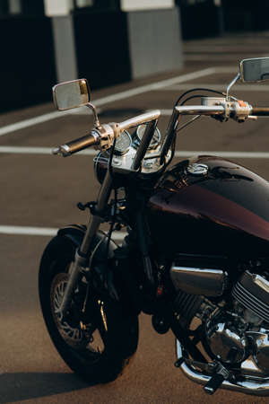 Motorcycle in the parking lot. Stylish custom chopper motobike with chrome details. Soft selective focus.