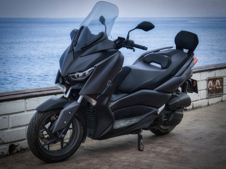 A black Maxiscooter on the background of the sea