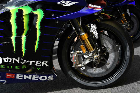 Almeria, Spain - May 4th 2021: Close up view of Yamaha motorbike front wheel with Dunlop tires during Dunlop Xperience showroom and test in Almeria, Spain.