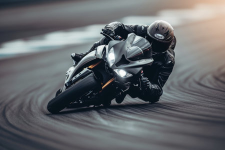 Motorcyclist riding and turning on motorbike very fast. Person wearing protective clothes. Dangerous extreme. Generative AI