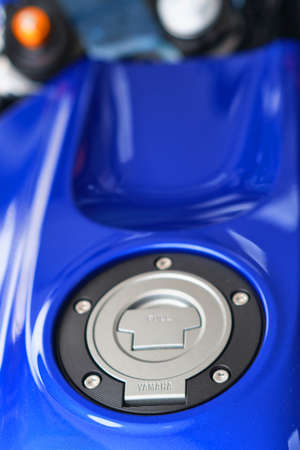 Motorcycles in the showroom Yamaha shop. Yamaha R15 v4 motorcycle, selective focus.