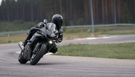 09/19/2020 Riga Latvia Handsome motorcyclist in black riding his super sport motorcycle