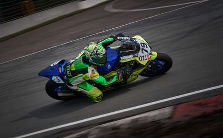 MOSCOW, RUSSIA - JULY 21, 2019: Racing bike rider leaning into a fast corner on the race track during the championship of Russia in motorcycle racing RSBK 2019 in Moscow Raceway