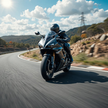 Motorcyclist riding motorbike very fast. Person wearing protective clothes. Dangerous extreme. Generative AI