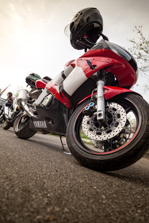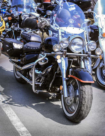 RIGA, LATVIA - APRIL 28, 2018: 2018 Moto Season Opening Event. A close-up of the most interesting details and attributes of motorcycles parked at the parade.