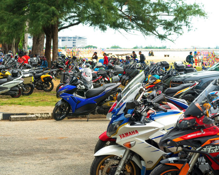 Kuala Terengganu, Malaysia - June 25, 2022: Motorcycles parking along the roadside during Terengganu bike week events.