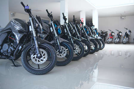 Lima, Peru - June 12, 2021: Motorcycles in the showroom Yamaha shop. New motorbikes and accessories in motorcycle store.