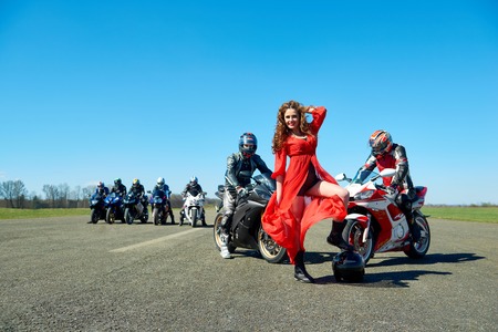 Kiev, Ukraine - 29 March 2017: Photo of young beatiful lady wearing red dispersing dress and posing in front of seven bikers, sitting on their motorcycles on blue sky background.