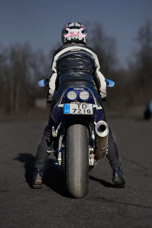 23-04-2020 Riga, Latvia. Young biker woman riding sport motorbike on road.