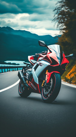 Sleek Red and White Motorcycle Parked on Road at Sunset