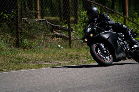 09/19/2020 Riga Latvia Handsome motorcyclist in black riding his super sport motorcycle