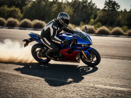 Motorcyclist riding motorbike very fast. Person wearing protective clothes. Dangerous extreme. Generative AI