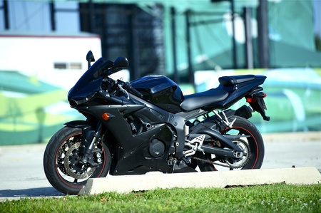 Black Sportbike Parked on the Street. Fast Sporty Looking Motorcycle. Horizontal Photo.