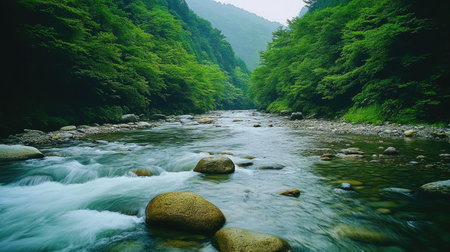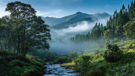 A tranquil mountain landscape is depicted, featuring a winding river flowing through verdant vegetation. The scene showcases a range of greens with subtle blues from the sky and fog. The composition highlights depth with a foreground river, mid-ground trees, and distant mountains. This image is suitable for various commercial and editorial applications.