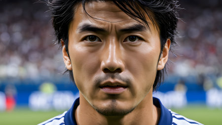 Snapshot of youthful Asian male against backdrop.