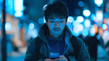 Wide angle shot of a senior chinese japanese man trendy clothes using mobile phone with background of urban city street at night. Generative AI AIG18.