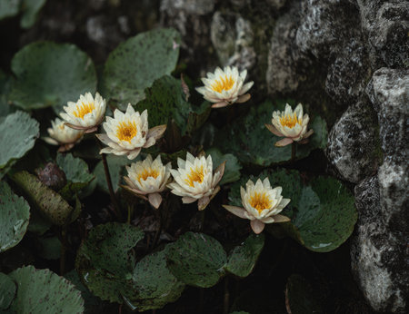 This image showcases elegant white flowers nestled among vibrant green leaves, creating a calming scene ideal for nature-themed projects and designs.
