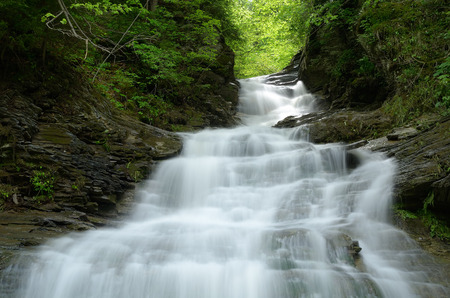 Waterfall on a mountain river with fresh clear water, massive stone dark rocks