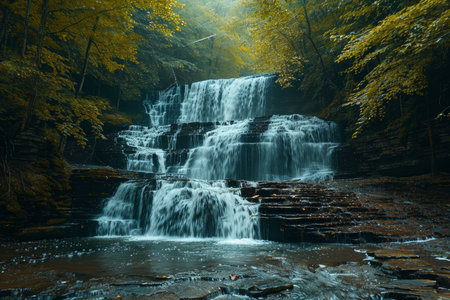 Tranquil autumn waterfall serenity surrounded by vibrant foliage and colorful trees in a picturesque natural landscape, showing the beauty of nature in the fall season