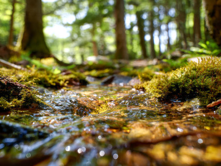 A serene woodland scene with a softly flowing stream weaving past vibrant moss-covered stones and scattered autumn leaves, illuminated by dappled sunlight amidst blurred