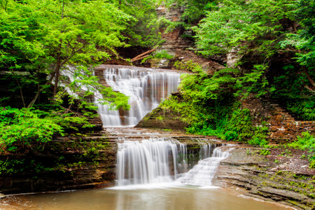 Tranquil waterfalls harmoniously blending with the verdant allure of a dense forest environment