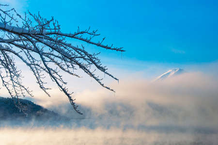 Mt.Fuji with misty in the morning at Lake Kawakuchi
