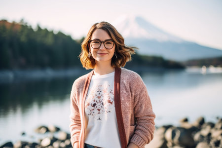 Portrait of a beautiful young woman with glasses on the background of Mount Fuji