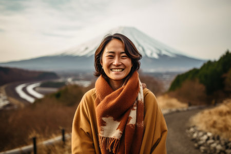 Asian woman smiling and looking at camera with Mt Fuji in the background