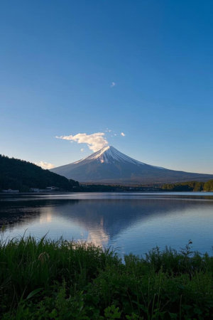 A breathtaking view of Mount Fuji at sunrise, reflecting perfectly on calm waters, surrounded by lush trees. The serene landscape captures tranquility and natural beauty.