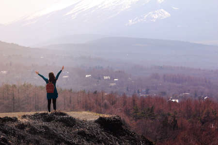 Freedom traveler woman standing with raised arms and enjoying on the peak of the mountain surrounded by beautiful natural. Travel and happiness Concept.