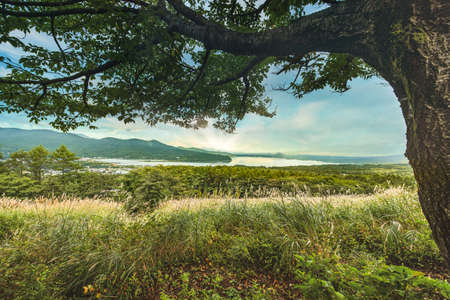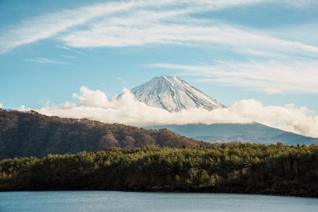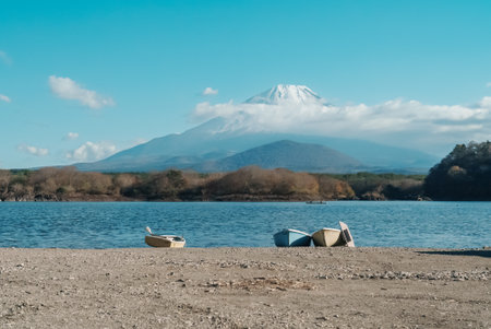 Mount Fuji at lake Shoji near Kawaguchiko, one of the Fuji Five Lakes located in Yamanashi, Japan. Landmark for tourists attraction. Japan Travel, Destination, Vacation and Mount Fuji Day concept