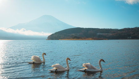 White Swan with Mount Fuji at Yamanaka lake, Yamanashi, Japan
