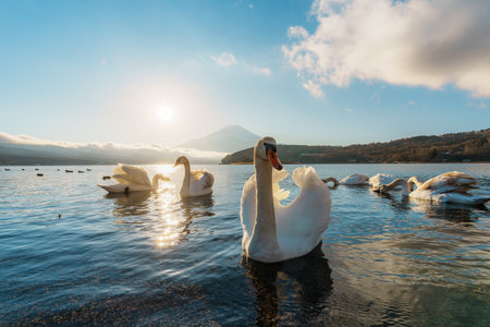 White Swan of Lake Yamanaka with Mt. Fuji background at Yamanashi,Japan. Lake Yamanaka is a point of view Mount Fuji is very popular for photographers and tourists. Travel and natural Concept