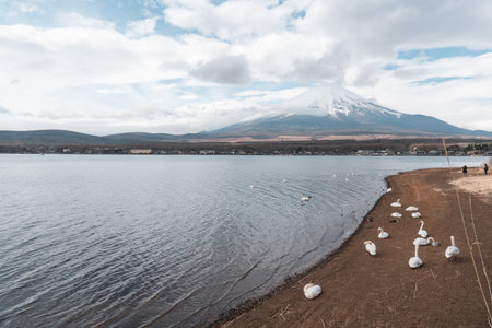 Beautiful white swans at Yamanaka lake with Mt. Fuji background in cloudy day during April
