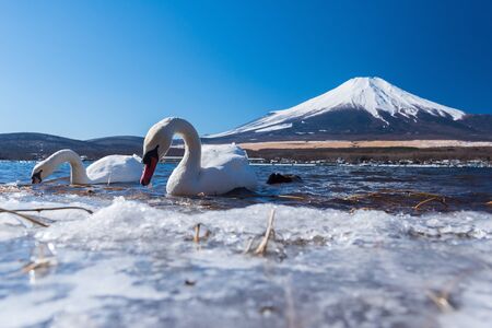 Group of White Swans in the Frozen Lake Yamanakako with Fuji mountain background in Winter, Japan