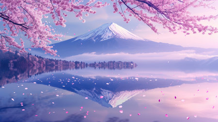 A majestic snow-capped Mount Fuji stands tall in the distance, framed by a vibrant display of delicate pink cherry blossoms. The gentle breeze carries petals through the air, creating a dreamy, ethereal scene.