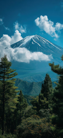 A majestic mountain is visible under a vast sky filled with clouds. The image features a vibrant blue sky, with white clouds gently embracing the mountain peak. The foreground is framed by tall, green trees. This scene is suitable for travel, tourism, and environmental projects.