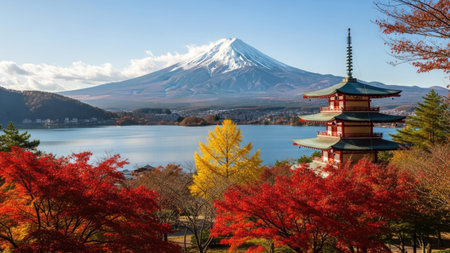 ai generated, fuji, fujisan, japan, autumn, fall, tokyo, scenery, japanese, asia, maple, mountain, lake, landscape, nature, red, beautiful, travel, background, tree, season, reflection, tourism, beauty, sky, water, asian, blue, scenic, mt, landmark, winter, light, fujiyama, momiji, mount, day, kawaguchi, yamanashi, outdoor, attraction, foliage, leaf, blossom, volcano, mount fuji, kawaguchiko, cherry, fog, colorful