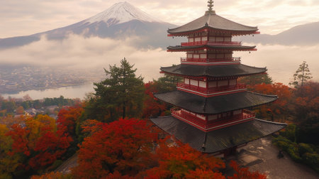 Beautiful landscape of mountain fuji with pagoda in autumn season at Yamanashi Japan