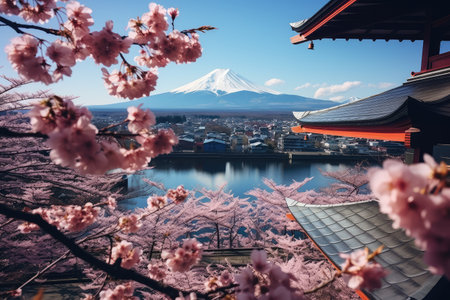 Majestic Mount Fuji, capped with snow, is seen from behind a vibrant cherry blossom tree and a stunning red pagoda in Japan. A picturesque view of the city and the iconic mountain.
