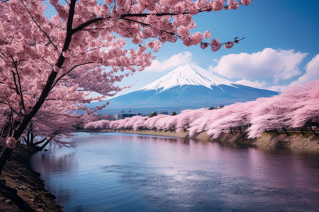 Fuji mountain and cherry blossoms in spring. Generative AI