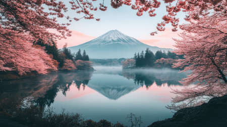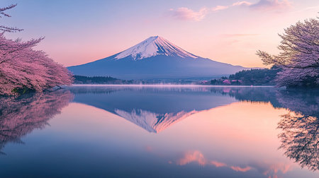 Fuji Mountain at dawn with pink sakura branches in full bloom, their reflection perfectly mirrored in Lake Kawaguchiko. A picturesque spring scene.