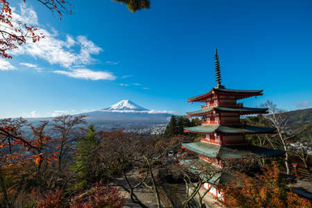 Red Chureito Pagoda and Snow covered Mount Fuji blue sky in Autumn.