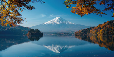 Scenic view of Mount Fuji mirrored in calm lake, surrounded by colorful autumn trees