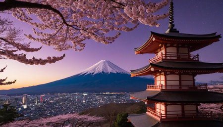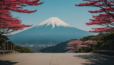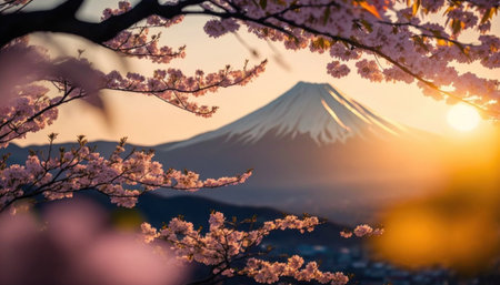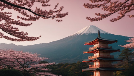 Experience the breathtaking beauty of Mount Fuji framed by vibrant cherry blossoms. This serene landscape captures the essence of springtime in Japan, inviting exploration.