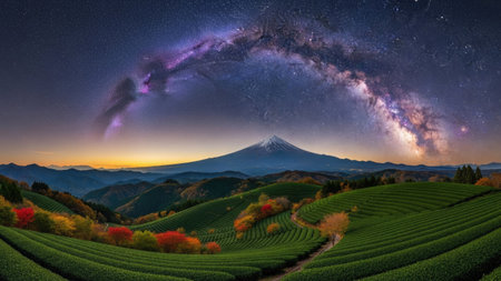 Milky Way over the tea plantations and Mt. Fuji, Japan