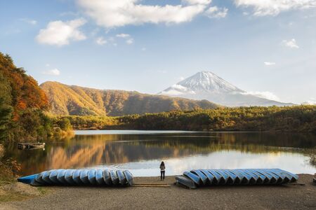 Woman Tourist enjoy sightseeing Fuji Mountain in Autumn at Lake Saiko, Fujikawaguchiko, Japan