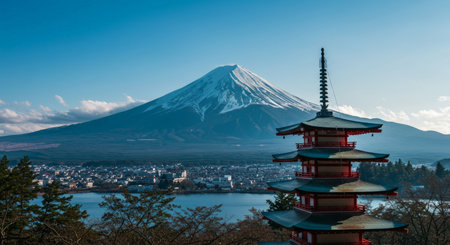 Mt Fuji and Chureito Pagoda at Kawaguchiko lake in Japan
