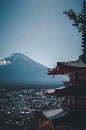 The iconic view of Mount Fuji with the red Chureito pagoda and Fujiyoshida city from Arakurayama sengen park in Yamanashi Prefecture, Japan.